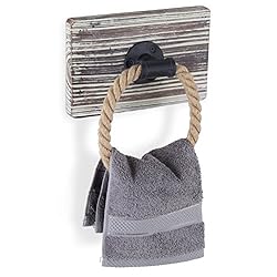 MyGift Rustic Rope Towel Ring for Bathroom, Hand Towel Holder with Industrial Metal and Torched Wood Backing