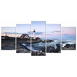 Wieco Art Portland Lighthouse 5 Panels Modern Canvas Prints Artwork Seascape Pictures to Photo Paintings on Stretched…