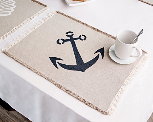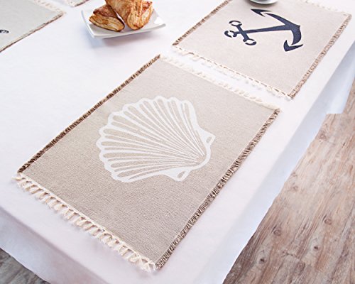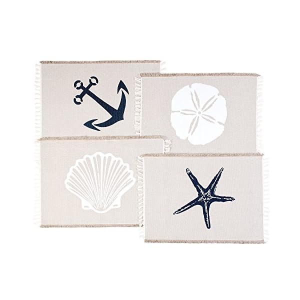 THE MOST BEAUTIFUL DESIGNS: Each some of the four Table Placemats has a unique beach themed coastal decor nautical design. There is one with a blue star and one with an anchor, both of them in a beautiful navy blue color. The other two designs are white and they are a shell and a sand dollar. The edges of the Placemats have elegant, short fringes.