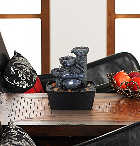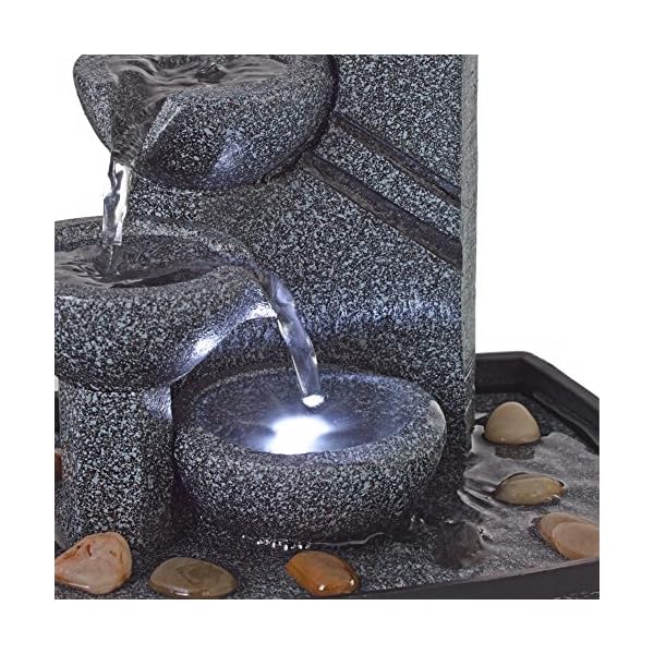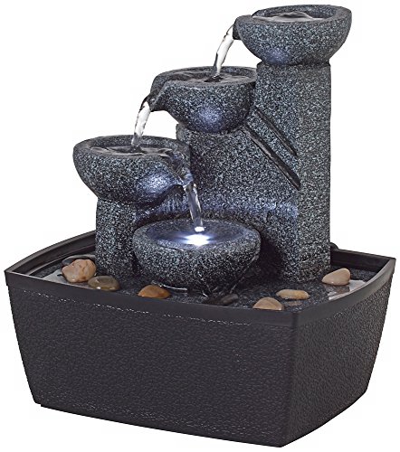 Earthy and natural, this tiered tabletop fountain is a smart decor accent for both indoor and out of doors areas. Finished in earthy stone and fabricated from lightweight resin that makes this design simple to transport and position where you need. Water cascades from the four bowls for a calming effect with included LEDs for simple middle of the night illumination and a comforting glow.