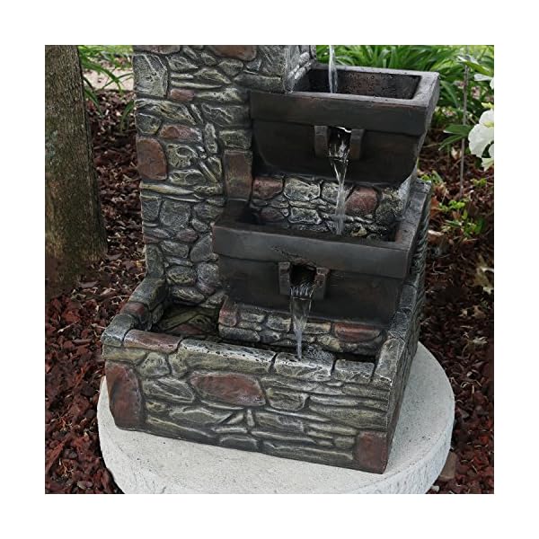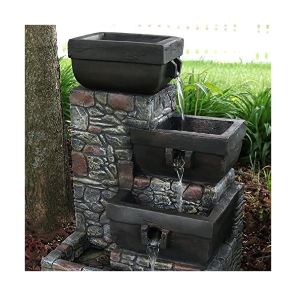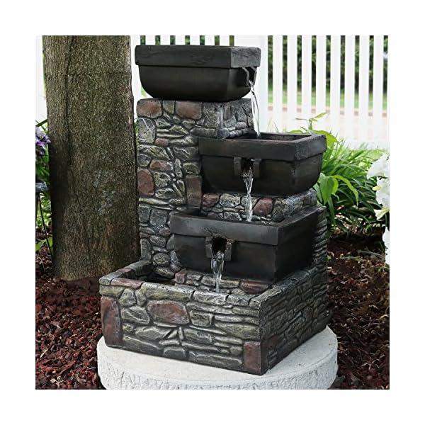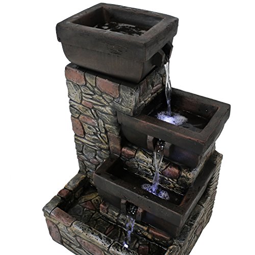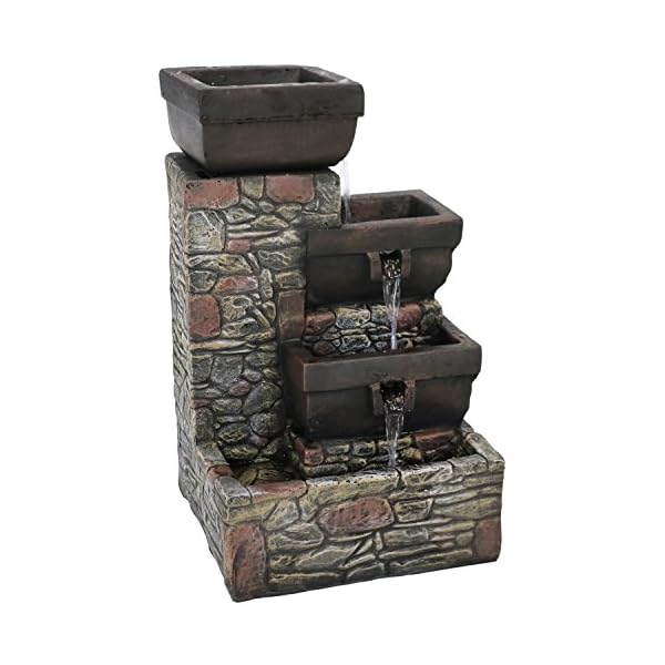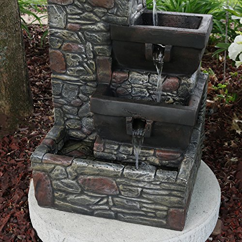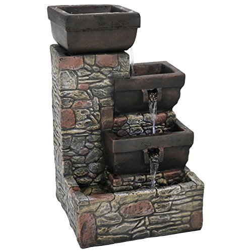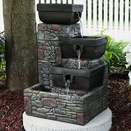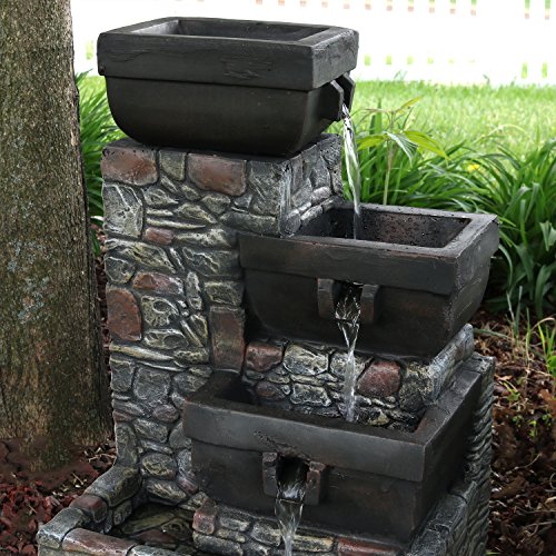 Add a striking accent to your patio with this outdoor fountain. Made of durable polystone, this water feature has the look of stacked stones with tiers of square-shaped bowls. Enjoy this fountain at night as the soft glow of the built-in LEDs in the two lower tiers and bottom basin illuminate the water as it gently flows down. Once the water reaches the bottom basin, it is recirculated through the included electric submersible JR-450LV AC 12V 60 Hz 0.72A pump.