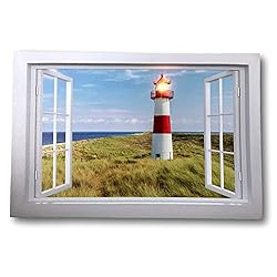 BANBERRY DESIGNS Lighthouse Canvas Print – LED Lighted Picture with a Window Scene Lake Beach – Nautical Artwork
