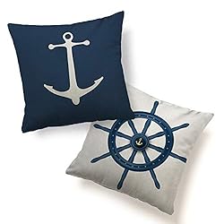 HUABEI Pillow Cover Cushion Case 2 Pack Home Decorative Print Anchor Helm Navy Nautical Throw Pillowcases Standard Size 18″x18″ Square for Sofa Couch Chair Home Décor Blue White